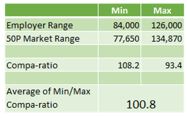 At first glance, it appears the employer’s range is just fine. It is entirely within the market range at the 50th percentile, according to the company policy. Let’s take a closer look.